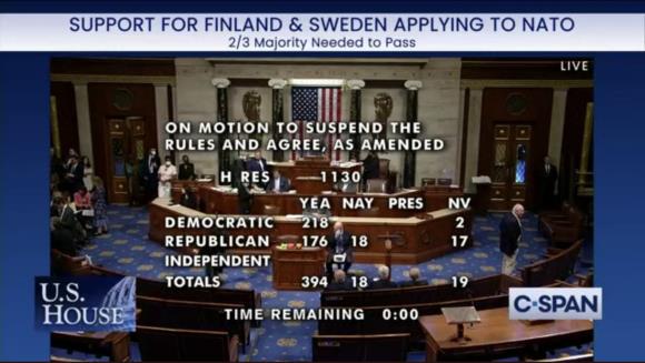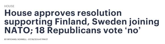 러시아 우크라이나 침공 이후 핀란드와 스웨덴이 NATO 가입 신청서 제출. 두 달 만에 하원에서 이를 지지하는 결의안 승인. 결의안은 394대 18로 통과했으며 공화당원만이 반대표를 던졌음. 2명의 민주당원과 17명의 공화당원은 투표하지 않음. 반대표를 던진 공화당 의원들: Andy Biggs (아리조나) Dan Bishop (NC) Lauren Boebert(콜로나) Madison Cawthorn(NC) Ben Cline(Va.) Michael Cloud(텍사스) Warren Davidson(오하이오) Matt Gaetz(Fla.) Bob Good(Va.) Marjorie Taylor Greene(Ga.) Morgan Griffith(Va.) Thomas Massie(Ky.) Tom McClintock(캘리포니아) Mary Miller(Ill.) Ralph Norman(SC) Matt Rosendale(Mont.) Chip Roy(텍사스) Jefferson Van Drew(NJ). |