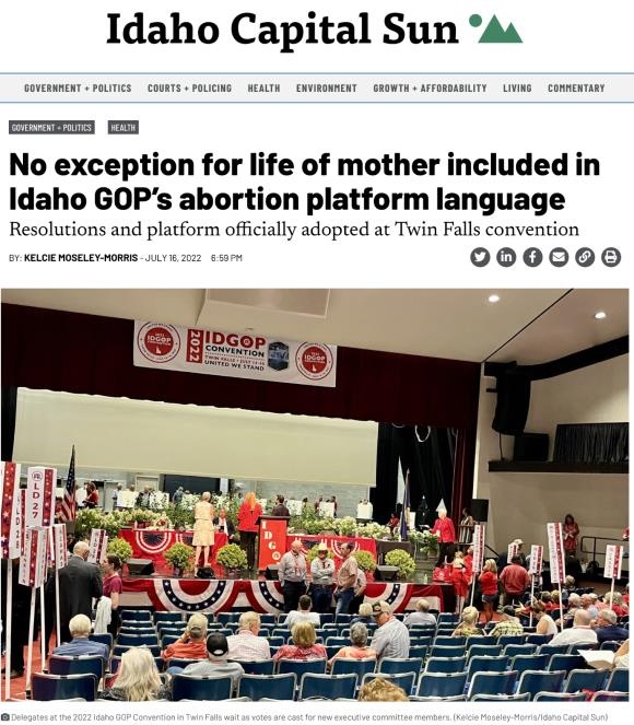 By a nearly four-to-one margin, Idaho Republicans at the state party’s convention in Twin Falls rejected an amendment to the party platform on Saturday that would have provided an exception for a mother who has an abortion to save her life. —— 아이다호 공화당은 25일 트윈폴스에서 열린 전당대회에서 산모의 생명을 구하는 목적의 낙태수술까지 불법화하기로 결정지었다. |