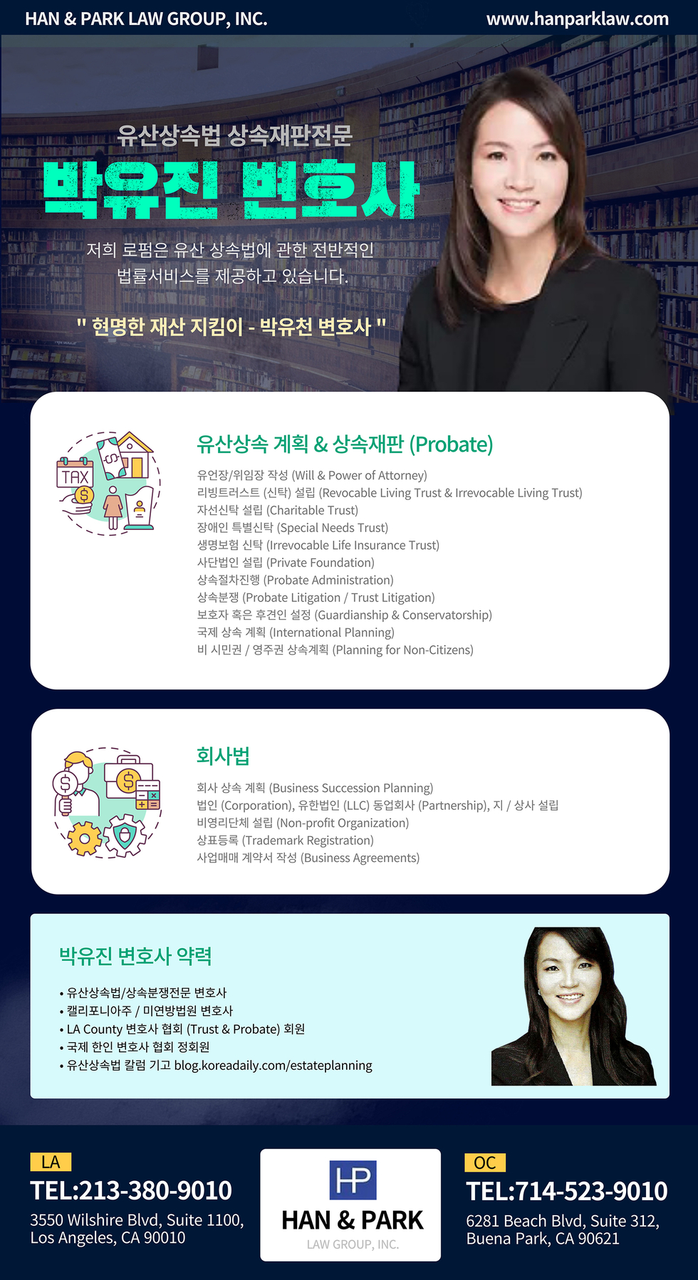 | * | 박유진 변호사 (HAN & PARK LAW GROUP INC) | 전체 관리자 | 2022/11/17 | 1429 | 0 |