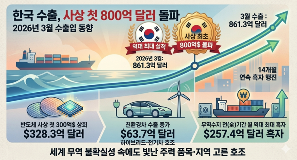 한국 반도체 수출이 3월 월간 기준 사상 처음으로 300억 달러를 돌파하며 역대 최대 기록을 경신했다. 전년 동기 대비 151.4%의 놀라운 성장률로 인공지능 반도체에 대한 글로벌 수요 폭발이 핵심 동력으로 작용했다.